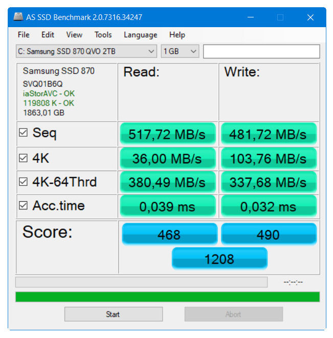 Otro test que ejecutamos habitualmente es el AS SSD Benchmark para comprobar lecturas/escrituras aleatorias IOPS. Como en el anterior, los resultados son excelentes, hasta donde se puede estirar SATA.