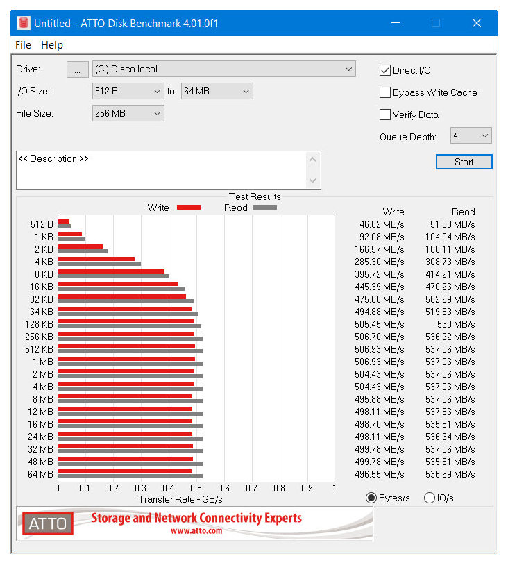 El ATTO Disk Benchmark evalúa el rendimiento según el tamaño de los archivos y como vemos desde 128 KB es tremendamente uniforme: