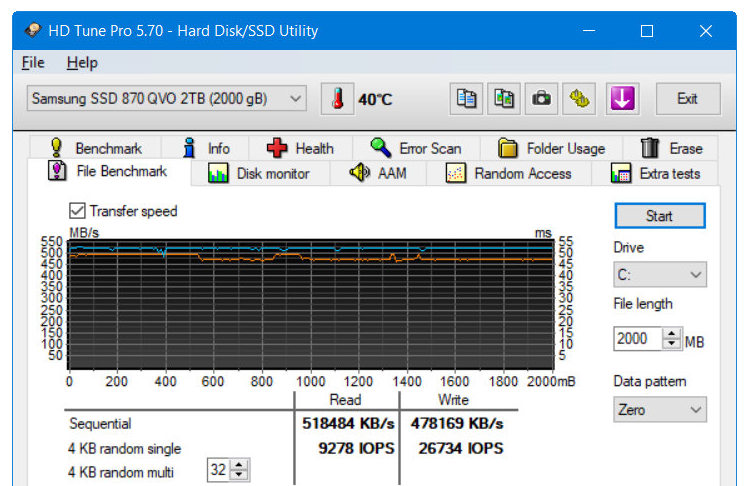 Terminamos con uno de los más exigentes, el HD Tune, confirmando que esta Samsung SSD 870 QVO es una de las unidades SATA más rápidas que hemos probado.
