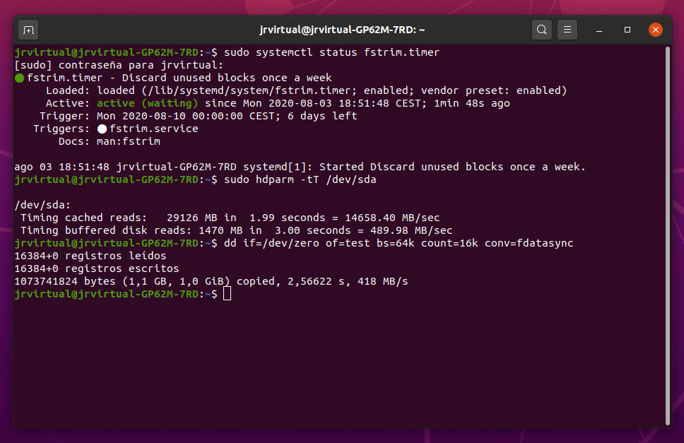 Con el comando dd comprobamos que está activado el comando TRIM por defecto y evaluamos la unidad. Aquí los resultados suelen ser más discretos de la unidad, algo que es norma con este comando.