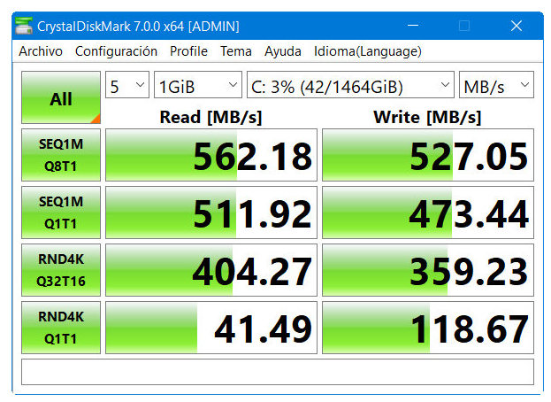 - Rendimiento secuencial: Hasta 560/530 MB/s en lectura / escritura