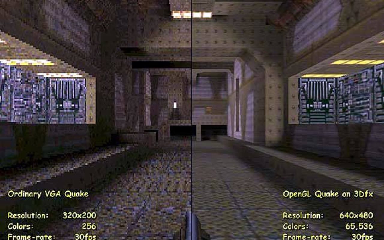 La versión Quake Arcade Tournament Edition funciona en una resolución mucho mayor y tiene una calidad gráfica bastante buena que confirma el uso de la API Glide. La diferencia es abrumadora, como podéis ver en la imagen adjunta.