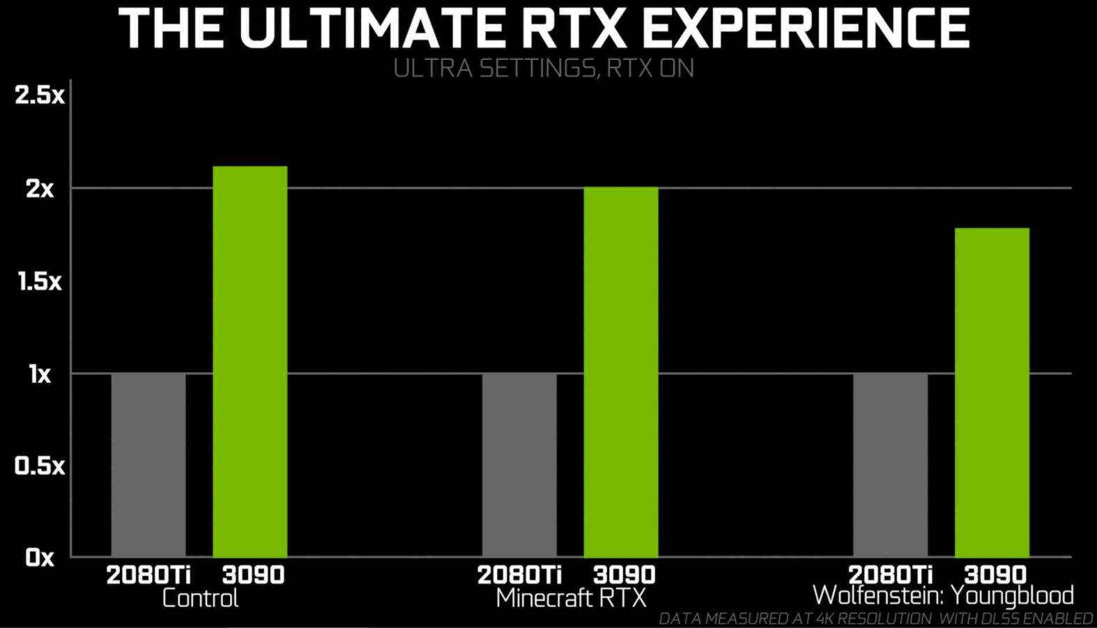 Tremendo potencial para esta gráfica, que según las diapositivas filtradas tendrá un aumento de rendimiento de hasta el 100% sobre una RTX 2080 Ti en algunos escenarios como a resoluciones 4K con DLSS y calidad Ultra en algunos juegos.