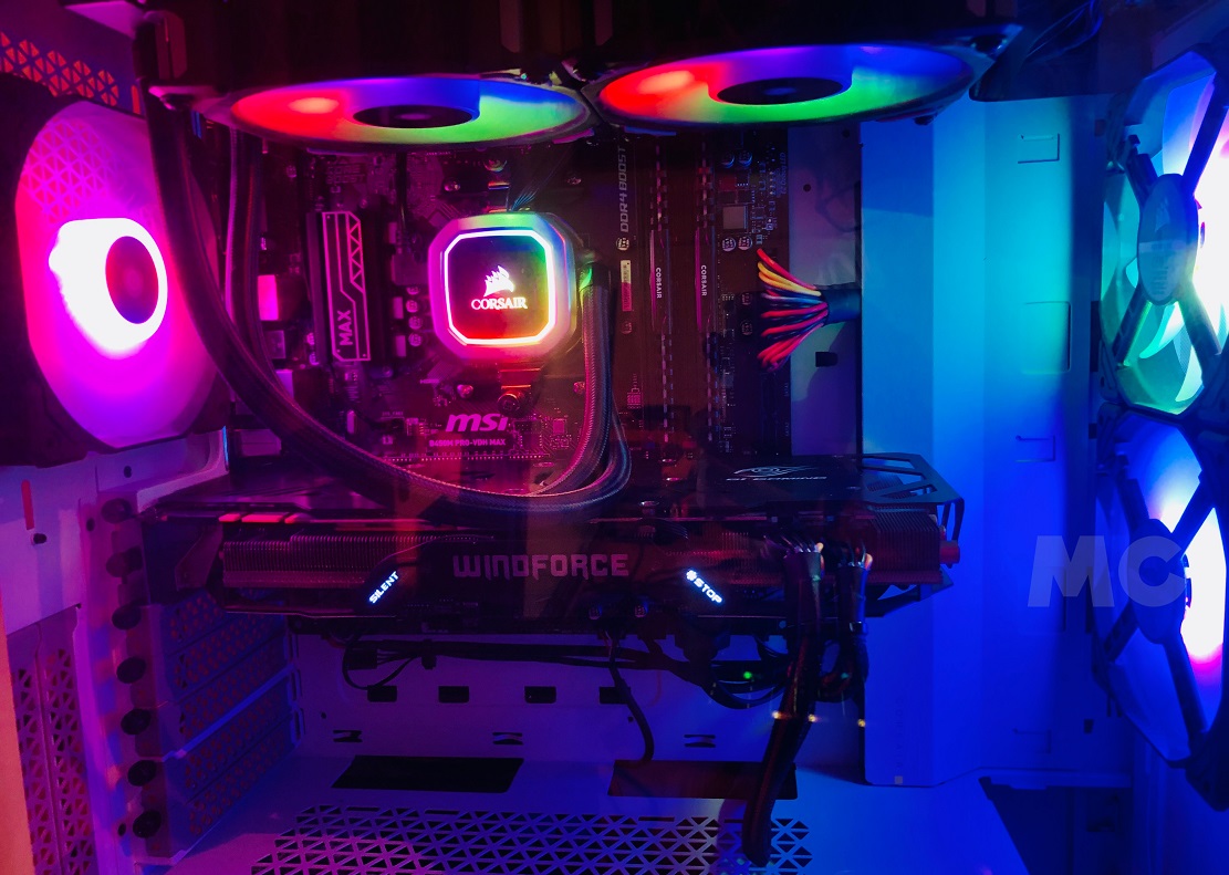 Si os fijáis en la parte superior, veréis que hemos montado el radiador de 240 mm de la Corsair Hydro Series H100i RGB Platinum, acompañado de dos ventiladores Corsair ML Pro RGB de 120 mm. Encaja sin problemas, y junto a los demás ventiladores da un toque de color al interior del chasis.
