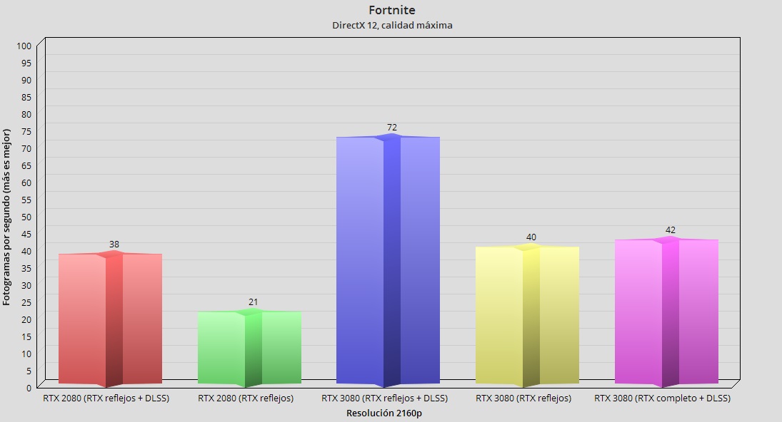 Sobre Fortnite quiero hacer un apunte importante por si alguien no se da cuenta de ello, y es que en la última gráfica, donde pone «RTX completo», nos referimos al rendimiento del juego con trazado de rayos aplicado a reflejos, sombras e iluminación. Con esa configuración y DLSS activado, la RTX 3080 todavía es capaz de superar a la RTX 2080 con DLSS y trazado de rayos aplicado solo a reflejos. Un resultado fantástico, sin duda.