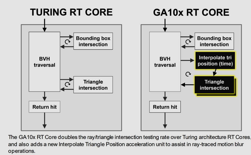 Ampere mantiene la división de la carga de trabajo de los núcleos RT de segunda generación en las clásicas pruebas de intersecciones transversales BVH, las intersecciones rayo-triángulo y a las intersecciones de delimitadoras de cuadro, pero añade, además, un nuevo elemento que permite interpolar la posición del triángulo en el tiempo, lo que hace que sea posible generar trazado de rayos con desenfoque de movimiento manteniendo una elevada precisión y, por tanto, una alta calidad gráfica.