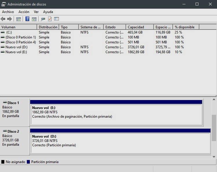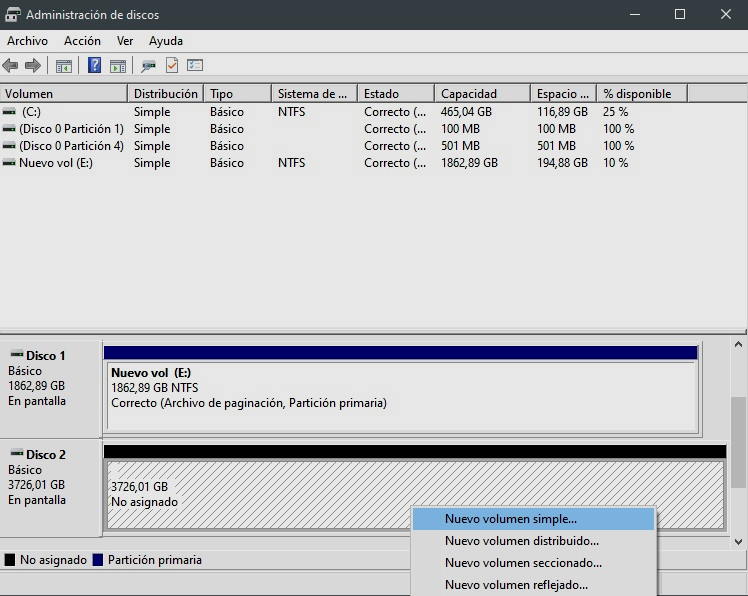 Una vez que hemos instalado el SSD tenemos que dirigirnos al «Administrador de Discos» de Windows 10 y realizar el proceso de asignación de unidad. Es muy sencillo, pero a continuación os dejo un resumen paso a paso: