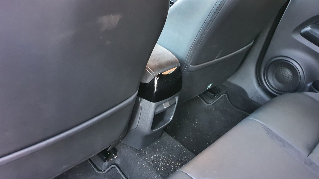 El túnel central está revestido parcialmente en piel tipo Alcántara y en nuestro caso la zona de la palanca de cambios automática con plástico brillante. Tras la palanca hay un pequeño espacio para objetos que no tiene tamaño suficiente para un teléfono móvil si lo colocamos de forma «natural», pero dispone de conexión USB.