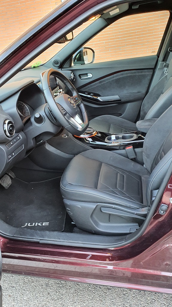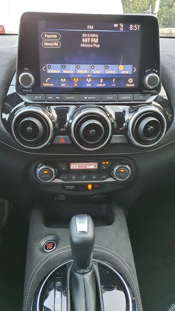 Son asientos cómodos y sujetan de forma excelente con buenos acabados y material. Los acabados están en línea con lo que encontrábamos en el anterior Juke aunque en este caso hay elementos de piel en el salpicadero y otros detalles agradables y bien resueltos. Sigue sin haber demasiado espacio para los objetos en la parte delantera.