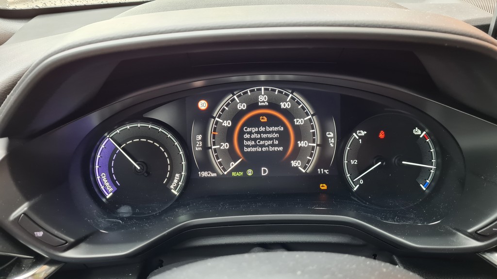 Obviamente en este caso dispondremos de datos de la carga de la batería así como el consabido dial en la parte izquierda que en vez de las revoluciones indica si el coche está en estado de recuperación de energía o de consumo de la misma y el grado de éstas. En la parte derecha además del nivel de carga se muestra la temperatura de la batería.