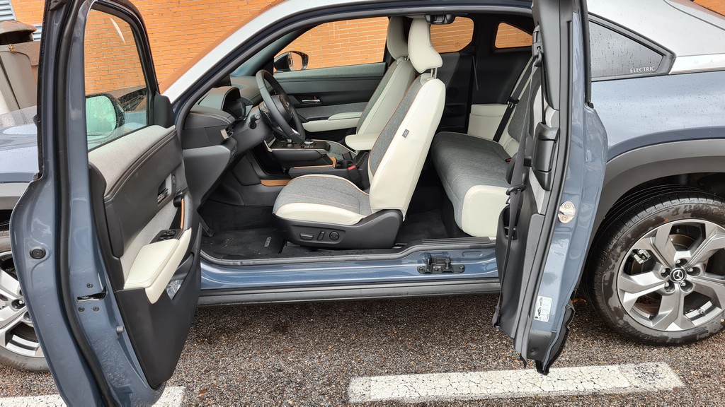 La apertura se realiza mediante un gran tirador colocado en la parte interna de la puerta y al hacerlo el pasajero de la parte delantera tiene que quitarse el cinturón. El hueco que resulta de abrir ambas puertas es muy amplio lo que permite realizar de forma más sencilla operaciones como la de instalar una silla para niño o cargar objetos en la parte de atrás. Sin embargo acceder a la fila trasera resulta inevitablemente más difícil que, por ejemplo, en un CX-30 ya que el hueco para acceder empieza más atrás.
