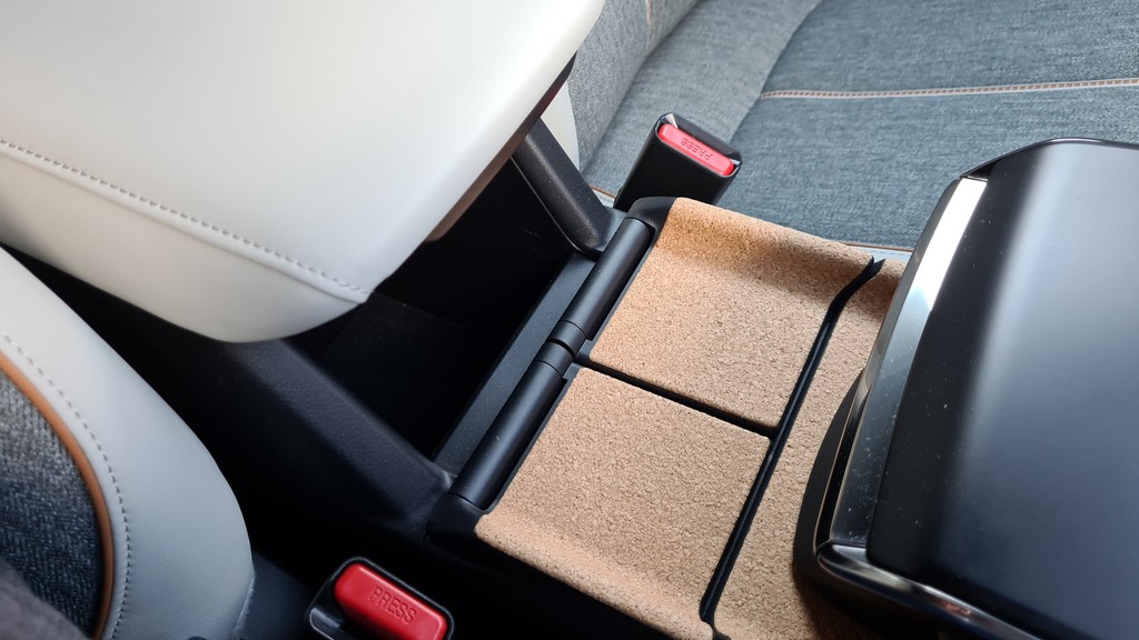 Tanto el mencionado hueco portaobjetos, de tamaño realmente generoso, se encuentra muy abajo y es algo incómodo acceder a él. Tanto este espacio como muchos otros elementos como la parte interior de los tiradores de las puertas o las tapas de los posavasos se han fabricado en corcho, un material con el que Mazda transmite compromiso con materiales más sostenibles.