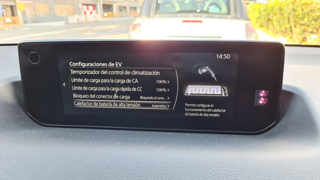 A diferencia de los sistemas de información de sus hermanos, en éste encontramos una completa sección donde obtener información y configurar todos los aspectos del funcionamiento del sistema de propulsión eléctrico como el calefactor de la batería para días de frío extremo, establecer límites y horarios de carga predefinidos, programar el arranque del climatizador para que funcione antes de que subamos al vehículo, bloqueo del conector de carga etc. Tareas como el programado de la carga, importante para cargar en casa en horas de tarifa valle, es sencillo e intuitivo y permite varias programaciones diarias, semanales o solamente para una ocasión.