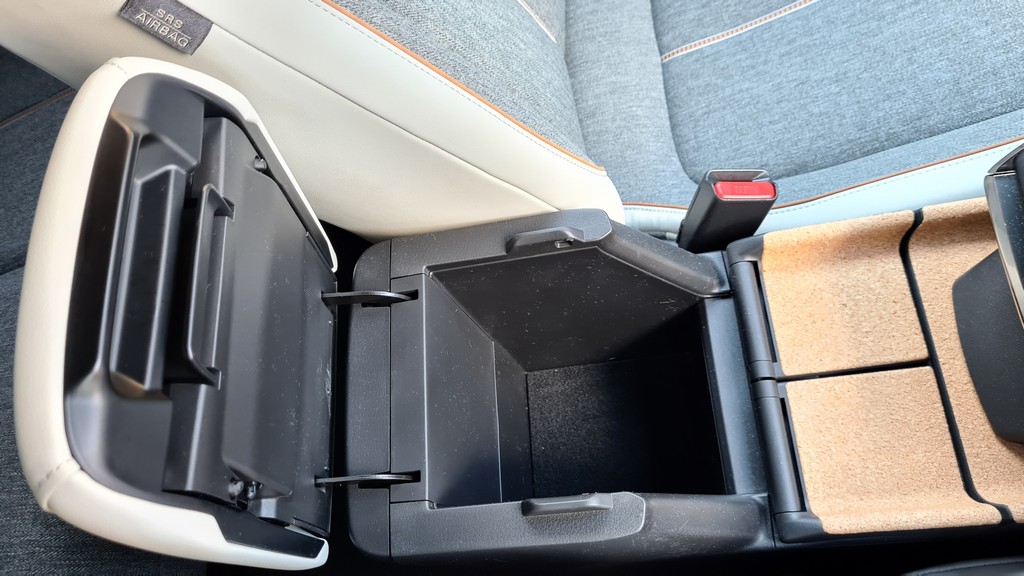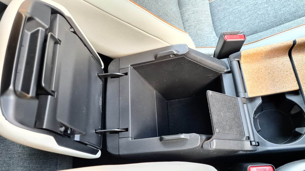 Tanto el mencionado hueco portaobjetos, de tamaño realmente generoso, se encuentra muy abajo y es algo incómodo acceder a él. Tanto este espacio como muchos otros elementos como la parte interior de los tiradores de las puertas o las tapas de los posavasos se han fabricado en corcho, un material con el que Mazda transmite compromiso con materiales más sostenibles.