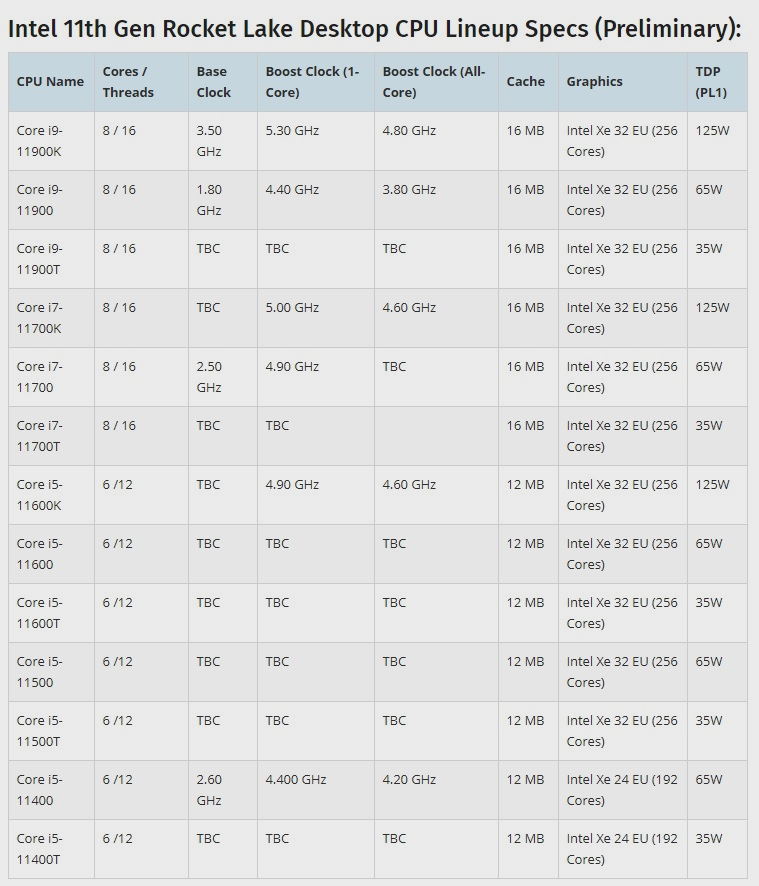 Esta nueva generación de procesadores será compatible con las placas base LGA1200, y con los chipsets serie 400. En el cuadro adjunto podéis encontrar un resumen con todos los procesadores que podrían formar parte de la nueva familia Core de undécima generación. El Core i9-11900 ocupará, junto con el Core i9-11900K, la cima de esta nueva serie.
