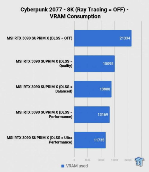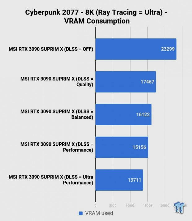 Echando un vistazo al consumo de memoria gráfica nos encontramos con algo muy interesante, y es que los 24 GB de GDDR6X que monta la GeForce RTX 3090 se quedan muy justos para mover Cyberpunk 2077 en 8K con calidad ultra, trazado de rayos y DLSS 2.0 desactivado, ya que el juego registra un consumo total de 23,2 GB de memoria gráfica. Activar el DLSS 2.0 en modo ultra rendimiento reduce el consumo a 13,7 GB.