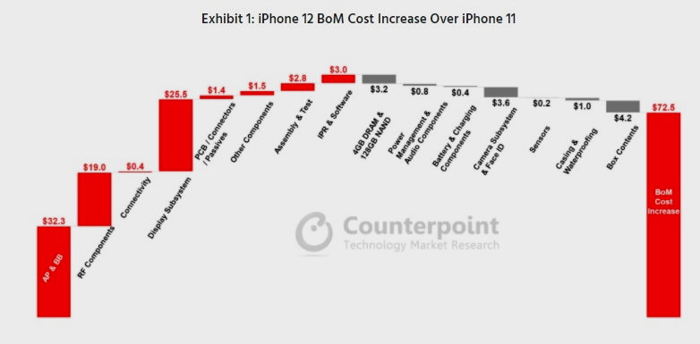 Esa es la cifra que nos deja la investigación que ha llevado a cabo la firma Counterpoint. Debo decir que me parece demasiado elevada, más que nada porque supera el coste de fabricación del iPhone 12 Pro que vimos en su momento, pero esto tiene dos explicaciones posibles: