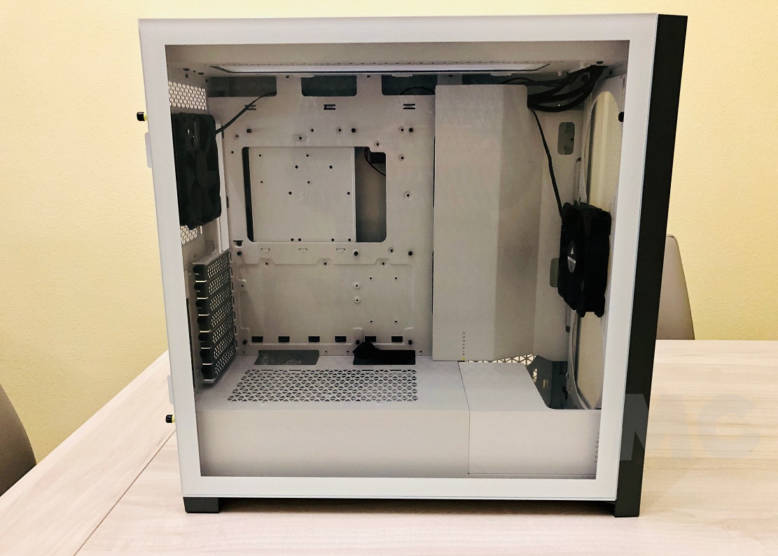 La gestión del cableado es, gracias al sistema Corsair RapidRoute, una auténtica maravilla. Ya tuve la ocasión de probarlo anteriormente con el montaje que realicé sobre la Corsair 4000D Airflow, y la Corsair 5000D Airflow mantiene exactamente el mismo concepto, aunque adaptado a las particularidades de una torre de mayor tamaño. En la parte trasera nos encontramos, además, con el espacio reservado a la fuente de alimentación, al lado de este están las dos bahías para montar dos unidades de 3,5 pulgadas, y en la parte central podemos montar hasta cuatro unidades de almacenamiento de 2,5 pulgadas. La cuarta unidad de 2,5 pulgadas iría situada encima de las tres bahías.