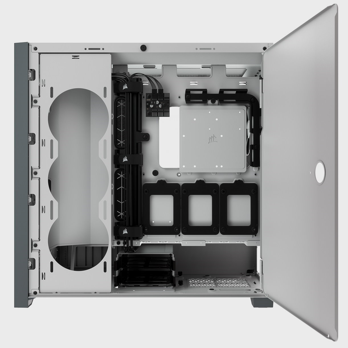 El proceso de montaje resulta muy intuitivo, gracias a la distribución eficiente, e inteligente, del espacio interno que ha realizado Corsair con la 5000D Airflow. La fuente de alimentación queda escondida en un espacio dedicado a ello, y podemos sacar todos los cables necesitamos a través de las dos aperturas que vemos en la imagen adjunta.