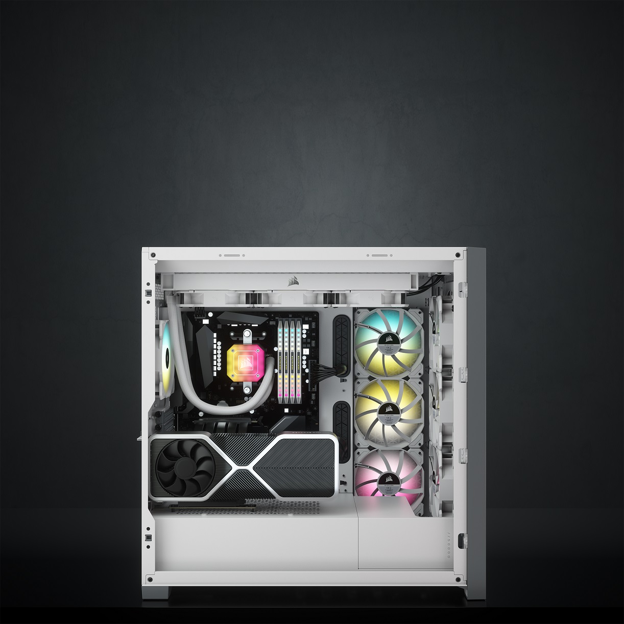 ¿Y qué podemos montar en la Corsair 5000D Airflow? Pues casi cualquier cosa. Tenemos tanto espacio, y tan bien distribuido, que en su interior nos cabría una configuración formada por 10 ventiladores de 120 mm, dos radiadores de 360 mm, un kit personalizado de refrigeración líquida, como el Hydro X Series iCUE XH305i RGB, por ejemplo, y podríamos ocupar sin problema las cuatro ranuras de memoria RAM con un kit al nivel de las Corsair DOMINATOR PLATINUM RGB WHITE.