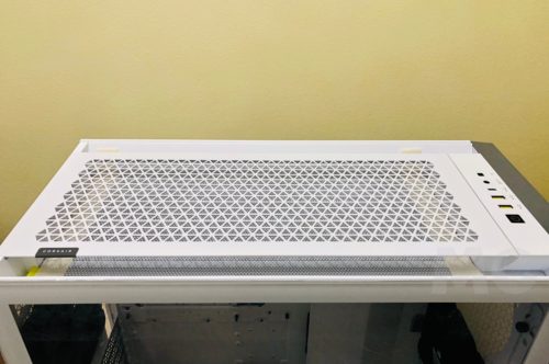 La zona de la derecha presenta una zona con pequeñas aperturas con forma triangular. Es, sin duda, una de las novedades más importantes que presenta la Corsair 5000D Airflow frente a otras semitorres de su gama, y tiene una explicación: en la cara interna de esa zona podemos colocar un máximo de tres ventiladores de 120 mm, bien para mejorar el flujo de aire, o para enfriar un sistema de refrigeración líquida.