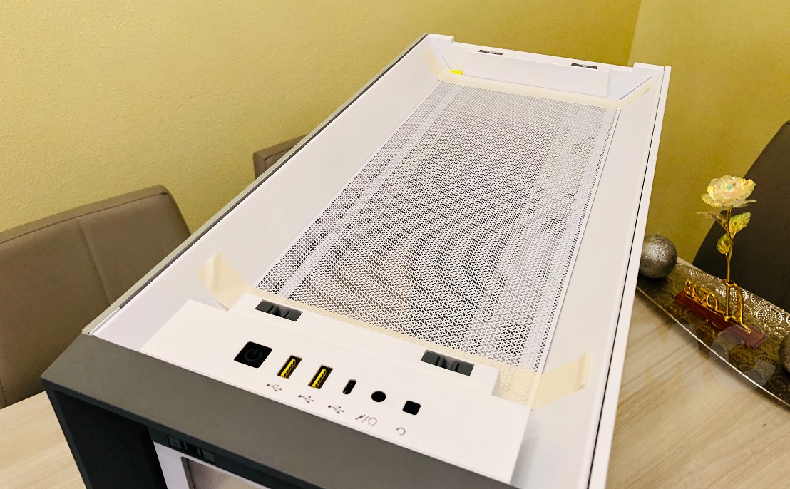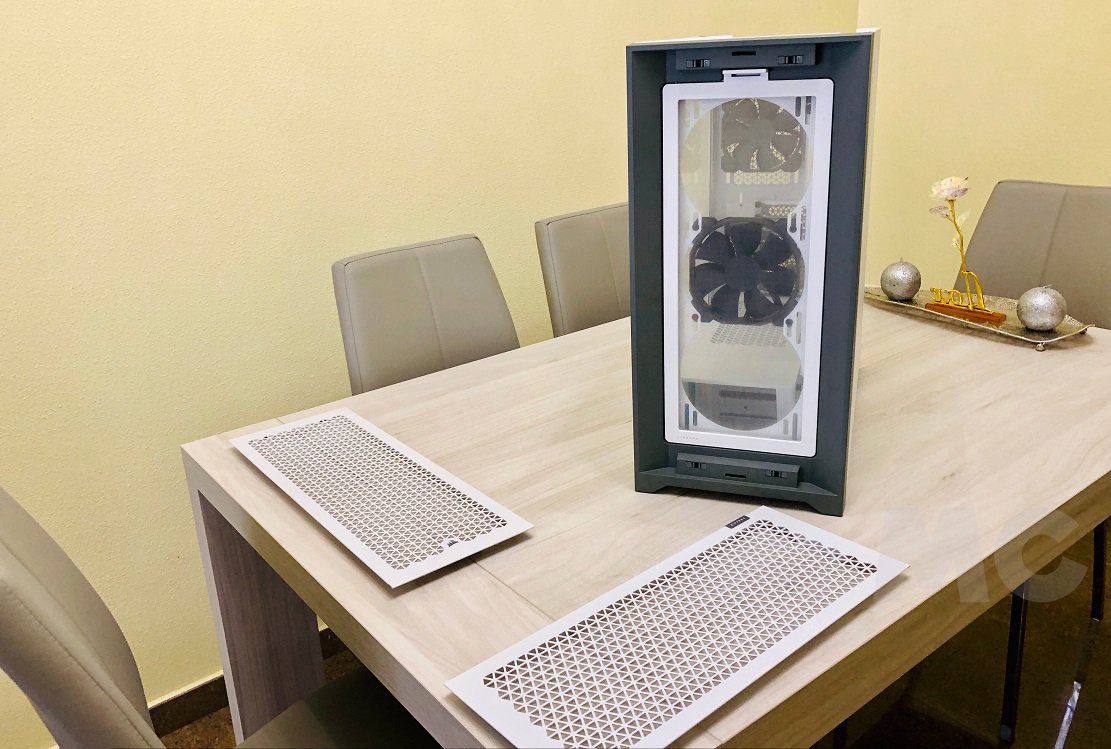 A la hora de montar la tarjeta gráfica tenemos dos opciones, podemos colocarla en horizontal, conectándola directamente a la ranura PCIE de la placa base, o podemos colocarla en vertical, utilizando las dos ranuras del lateral. Para que el polvo no sea un problema, la Corsair 5000D Airflow viene con un total de cuatro filtros, distribuidos de la siguiente manera: uno en el frontal, otro en el lateral derecho (en las aperturas para los tres ventiladores), otro ubicado en la parte superior y el último colocado en la parte trasera inferior.