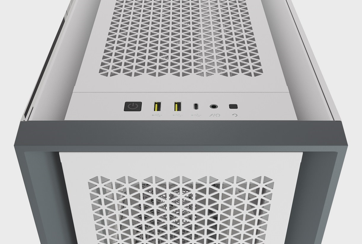 En la parte superior vemos otra tapa de acero con el mismo patrón de aperturas con forma triangular y contamos con dos conectores USB Type-A 3.0, un conector USB Type-C 3.1 y un jack de 3,5 mm para auriculares y micrófono. Junto a dichos conectores se encuentran los botones de encendido/apagado y de reset.