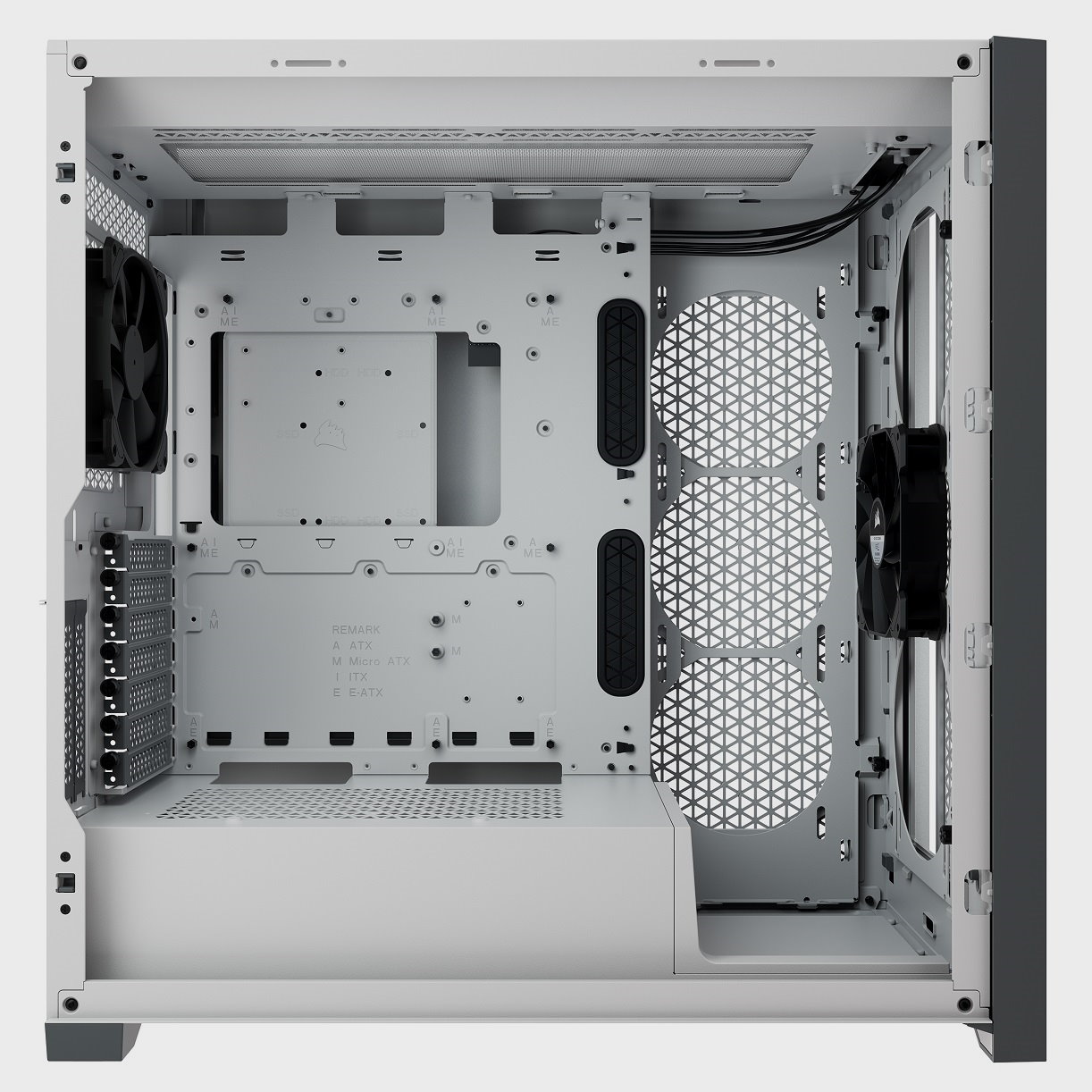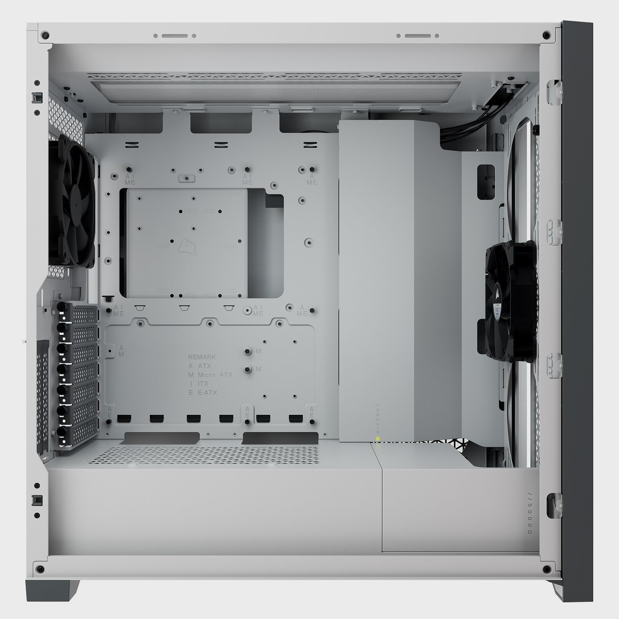 Es la mejor manera de describir esta semitorre por todas las posibilidades de montaje que ofrece. Como hemos anticipado al repasar sus especificaciones, tenemos espacio interno para montar, incluso, una placa base E-ATX. No es lo normal, pero Corsair ha querido llegar a una mayor cantidad de usuarios al ofrecer este abanico tan amplio de soporte de formatos de placas base.