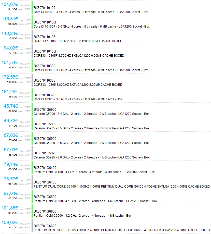 Dentro de la serie Intel Core 11 el procesador más económico sería, según esta filtración, el Core i3 10105F, un chip que contaría con cuatro núcleos y ocho hilos a una frecuencia base de 3,8 GHz y que tendría un precio medio, sin impuestos, de 80 euros. Con un 21% de IVA, su precio sería de 96,92 euros.
