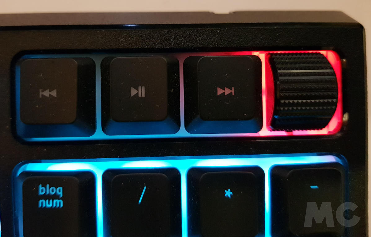 El más notorio a la vista es el añadido de una rueda digital multifunción situada sobre el teclado numérico. Actúa por defecto como control de volumen, aunque puede personalizarse para otras tareas. Bien concebido y resuelto, a su lado se sitúan tres teclas dedicadas para funciones de medios y otras adicionales a continuación como la destinada al modo de juego y a las macros.
