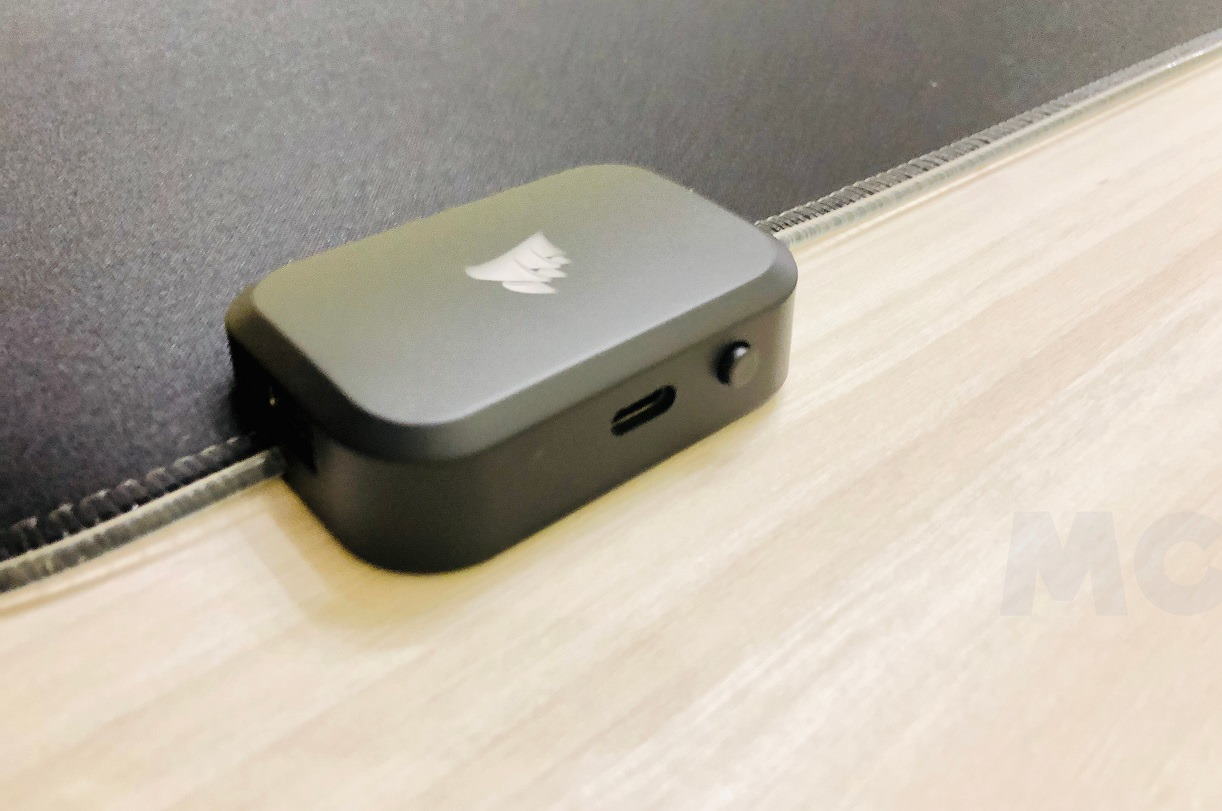 Para activar la iluminación LED RGB, tenemos que conectarla a un puerto USB Type-A. No tiene misterio, solo debemos conectar el USB Type-C al concentrador de puertos de la alfombrilla, y el USB Type-A a nuestro PC. Una vez hecho, la iluminación se activará, y podremos personalizarla a través de un botón integrado, que alterna entre ocho perfiles predefinidos, o a través de iCUE, donde podremos crear nuestros propios perfiles. El concentrador cuenta con dos puertos USB Type-A para conectar otros periféricos.