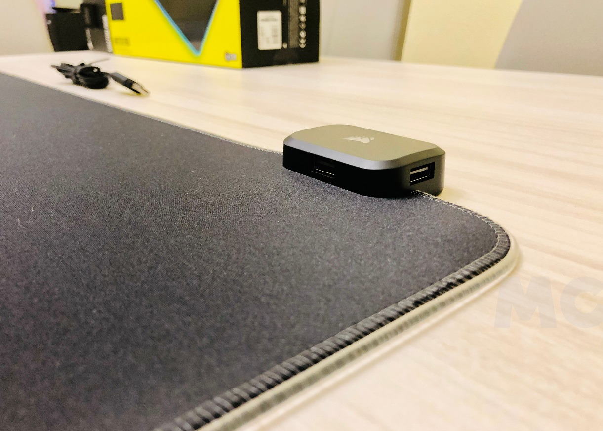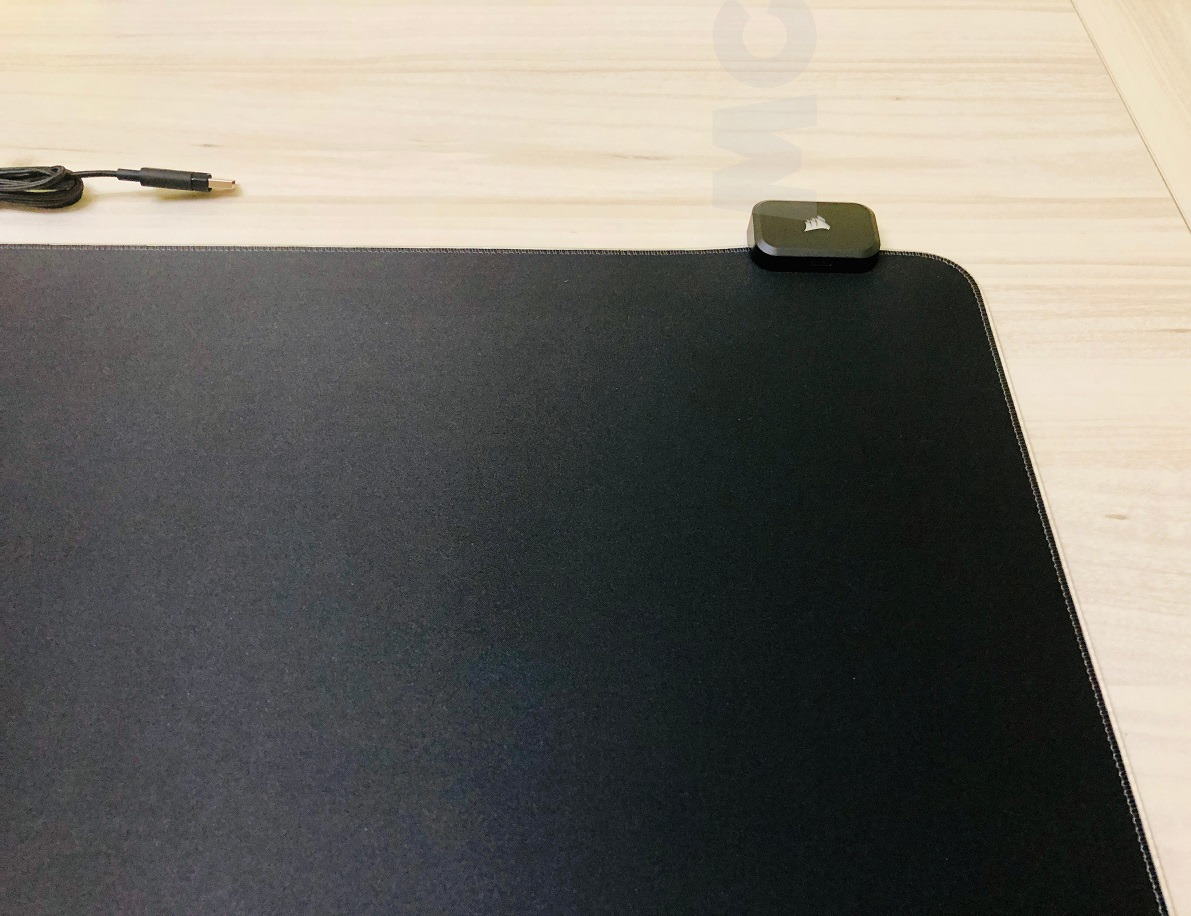Por lo que respecta al diseño, me gusta el tono negro dominante de la alfombrilla, ya que le permite encajar en cualquier escritorio, y genera un excelente contraste con el sistema de iluminación LED RGB. En la parte inferior izquierda aparece la marca «Corsair», y en el concentrador USB se sitúa el logotipo, que se ilumina en función de los ajustes que hayamos configurado.