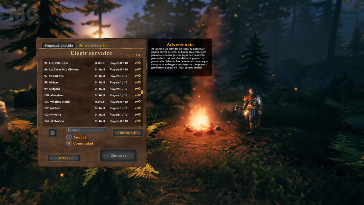 La segunda pestaña del menú después de la selección del personaje es «Unirse al juego», con la que podremos ver el resto de servidores creados por la enorme comunidad de jugadores, así como nuestros amigos de Steam, a los que podremos unirnos de esa manera. Sin embargo, una de las grandes desventajas de este segundo es el hecho de que los servidores que alojan los mundos de cada partida estarán ligados al jugador que los crea, por lo que no podremos conectarnos a ellos cuando éste no esté en línea.