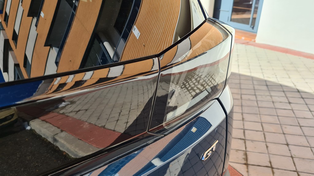 En la parte trasera encontramos el diseño de los grupos ópticos con aspecto de líneas paralelas verticales inclinadas enmarcadas en una banda de color negro que recorre toda la parte trasera de la carrocería y que limita con el parabrisas. El portón de generosas dimensiones limita con un parachoques prominente en color negro. Más abajo en la parte inferior del paragolpes encontramos el tubo de escape cromado doble.