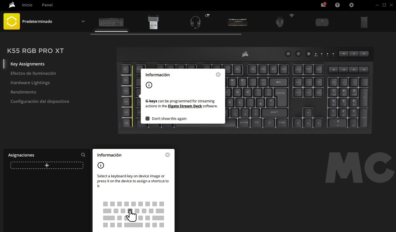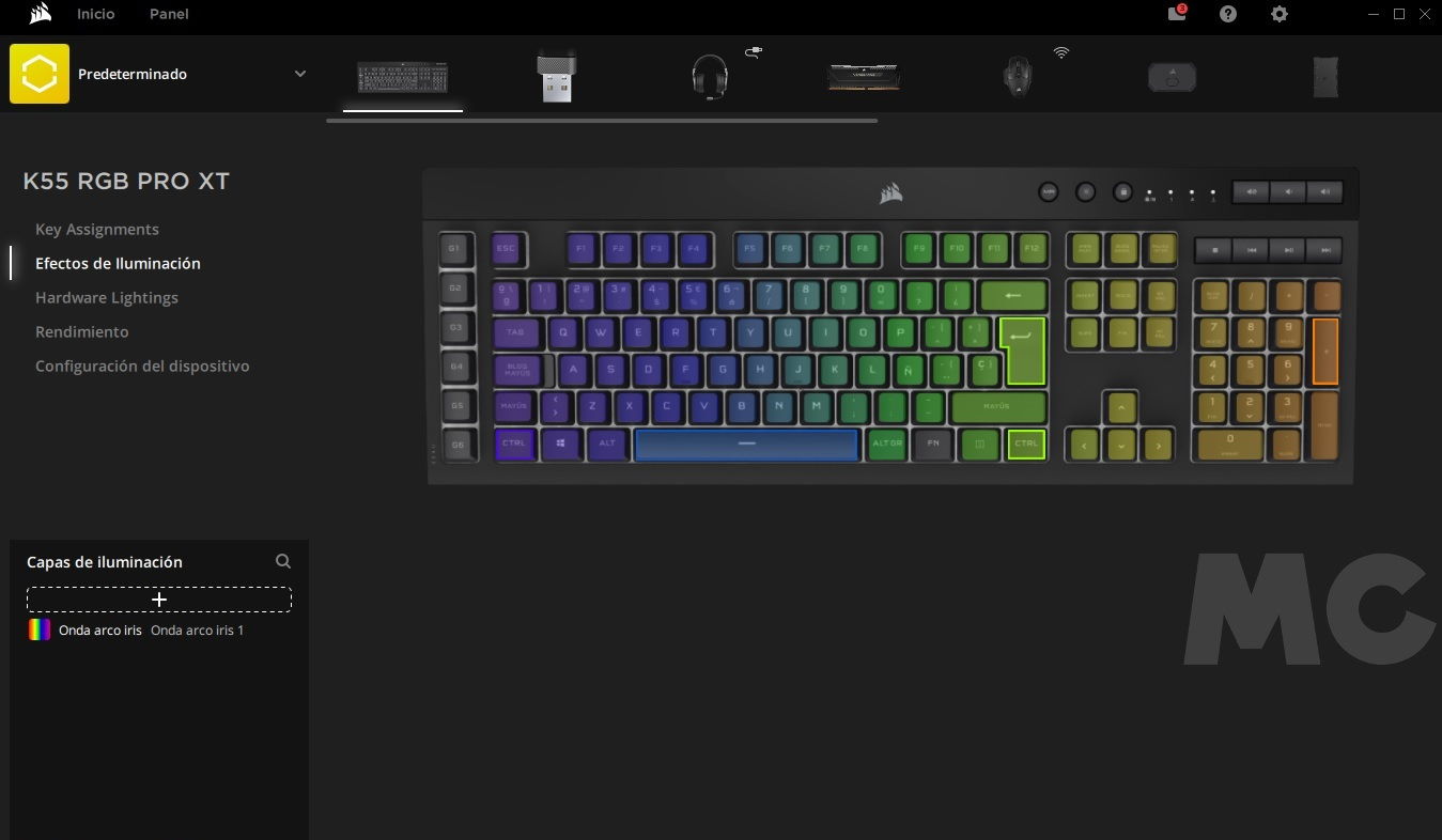La integración con iCUE es total, tanto en lo que respecta a creación de macros y acciones como a la personalización del sistema de iluminación LED RGB. Como anticipamos, cada tecla está individualizada, y esto marca una gran diferencia frente al Corsair K55 RGB PRO, que está limitado a una iluminación por zonas. Tras este primer vistazo, estamos listos para entrar de lleno a ver sus características clave.