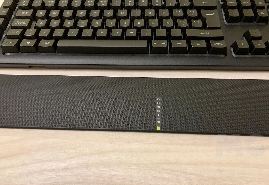 La sección inferior alberga el espacio necesario para insertar el reposamuñecas. Este tiene un acabado gomoso y una textura rugosoa, y añade un importante toque de ergonomía al Corsair K55 RGB PRO XT. Es muy fácil de quitar y de poner, así que no tendremos problemas para alternar su uso en función de nuestras necesidades. A la hora de limpiarlo también lo tendremos muy fácil, ya que basta con quitarlo y lavarlo con un poco de agua y jabón. En la cara posterior del teclado vemos una base con cuatro piezas de goma, indispensables para asegurar un buen agarre, y dos elevadores para subir la altura del teclado y ajustar mejor la ergonomía.