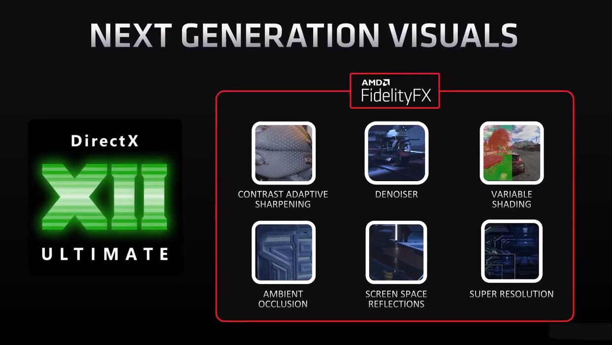 - AMD FidelityFX Variable Shading (VS), un sombreador de tasa variable que ajusta la calidad del sombreado en función de cada escena en concreto, reduciendo con ello la carga de trabajo y mejorando el rendimiento sin sacrificios importantes en la calidad de la imagen.