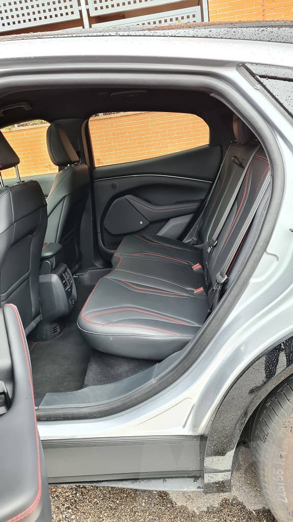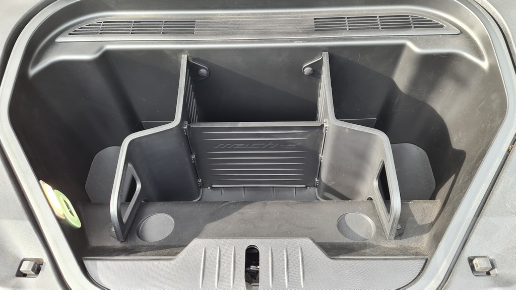 En la parte posterior el espacio también es grande y puede acoger a adultos de buena estatura sin problemas de espacio para las piernas. El espacio parece aún más grande gracias al amplio techo solar que permite que entre la luz dentro del coche. Este Mustang al igual que los modelos de Tesla (otro guiño más) dispone de dos maleteros de buen tamaño. El trasero tiene una capacidad de 402 litros y un volumen muy regular lo que facilita la carga de bultos. El delantero también es bastante grande, 81 litros, y está compartimentado mediante piezas de plástico que pueden retirarse.