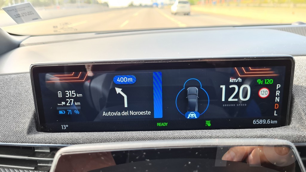 Además a diferencia del Model 3 y el Model Y Ford sí que proporciona una pequeña pantalla de información detrás del volante que sobresale del salpicadero. Esta pantalla no tiene un tamaño grande pero sí ofrece toda la información necesaria sobre velocidad, autonomía, instrucciones de navegación… de forma clara y altamente visible, uno de los aciertos de Ford en este coche sin ninguna duda y una de las muchas enmiendas a la propuesta de Tesla que podemos encontrar en este coche. Un detalle es que la pantalla funciona también con Android Auto por lo que en ella podremos visualizar las instrucciones de Google Maps si preferimos usarlo como asistente de navegación.