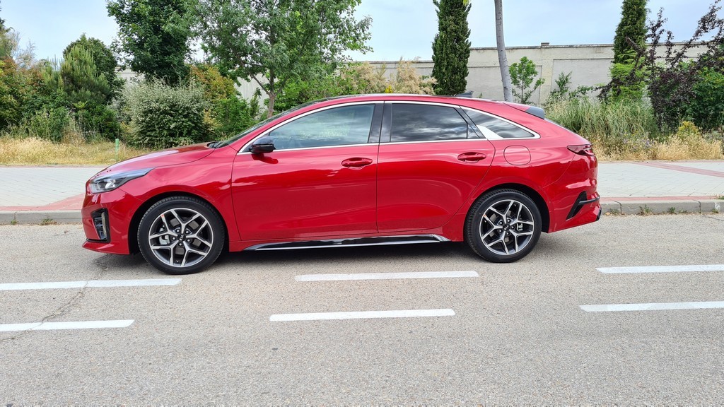 El diseño del perfil del coche es lo primero que deja claras las intenciones de este Kia con una línea estilizada que, como es habitual en los modelos «sport wagon», alarga su caída hacia el final para mostrar una línea suave y aerodinámica que culmina en un spoiler ancho y con aspecto deportivo. Para conseguir esta línea deportiva Kia ha extendido el voladizo de la parte posterior del coche con respecto al Ceed Tourer y ha rebajado su altura y la distancia con el suelo. Todos ingredientes para dar más dinamismo al diseño del coche.