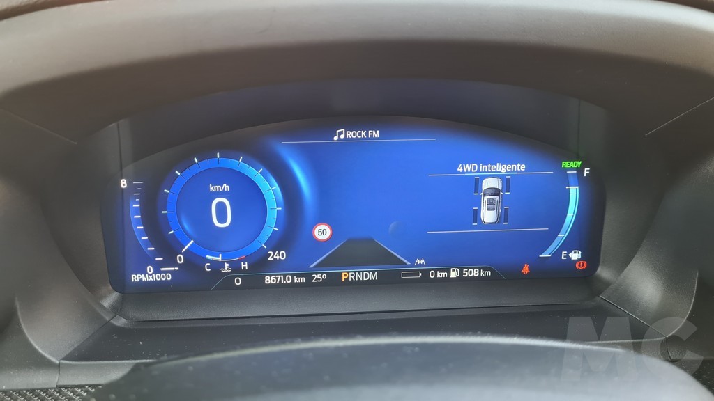 El panel de instrumentos del Explorer también es digital y muy sencillo aunque también presenta información suficiente. Es configurable para que muestre la información que necesitemos pero en la parte izquierda podremos ver el marcador de velocidad con forma circular y a su izquierda un indicador curvo en el que se muestran las revoluciones. En el extremo derecho podemos ver el indicador de capacidad del depósito de combustible. También podemos configurar el indicador con otros aspectos y recuperar los dos diales indicadores tradicionales con la velocidad y las revoluciones.