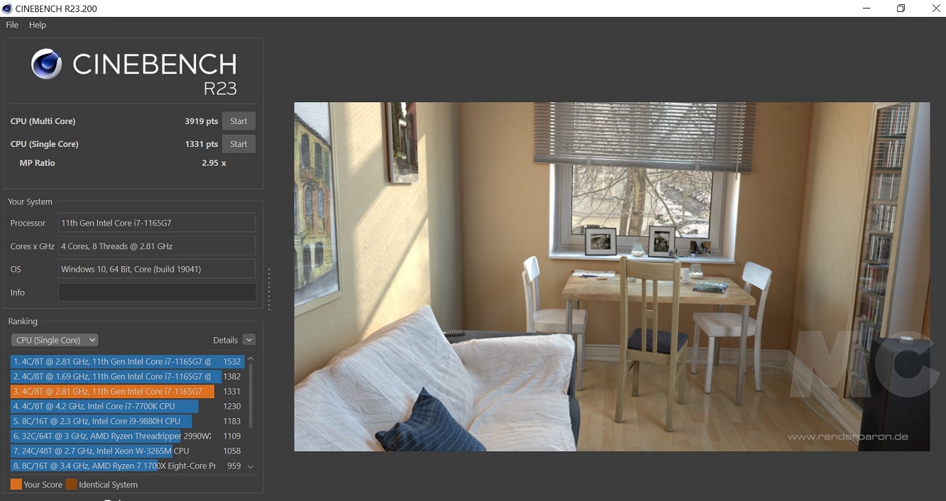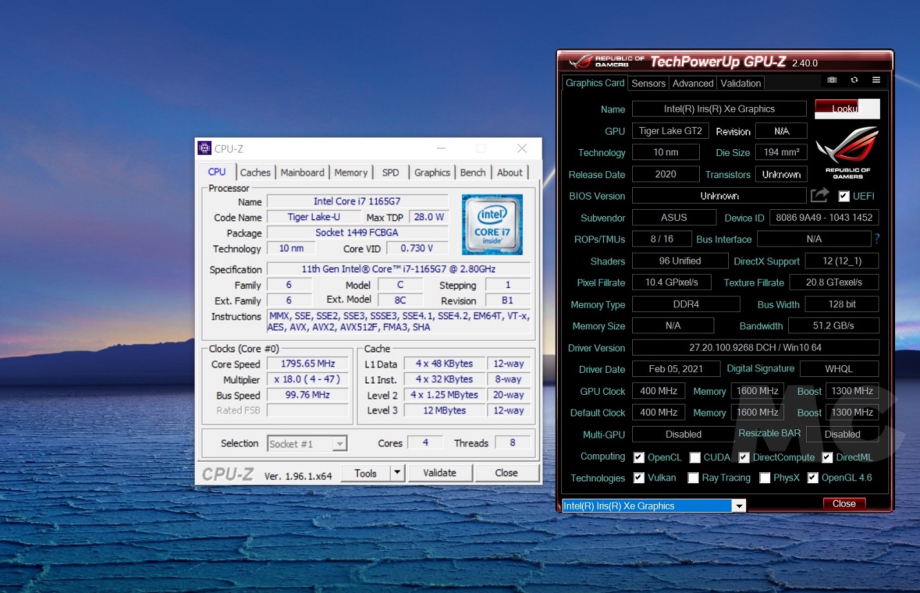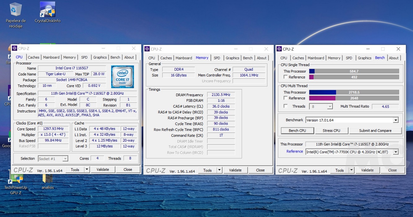 Si activamos el perfil de alto rendimiento (podemos controlarlo a través de la herramienta MyASUS), el ruido aumenta, pero se mantiene en un nivel más que aceptable, y el Core i7-1165G7 puede desarrollar todo su potencial. Como podemos ver en la imagen adjunta, en CPU-Z logra superar sin problemas al Intel Core i7-7700K, un chip con un TDP mucho mayor que alcanza, además, velocidades más elevadas.