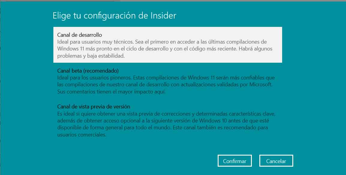 - Canal de desarrollo: Ideal para usuarios muy técnicos. Sea el primero en acceder a las últimas compilaciones de Windows 11 más pronto en el ciclo de desarrollo y con el código más reciente. Habrá algunos problemas y baja estabilidad.