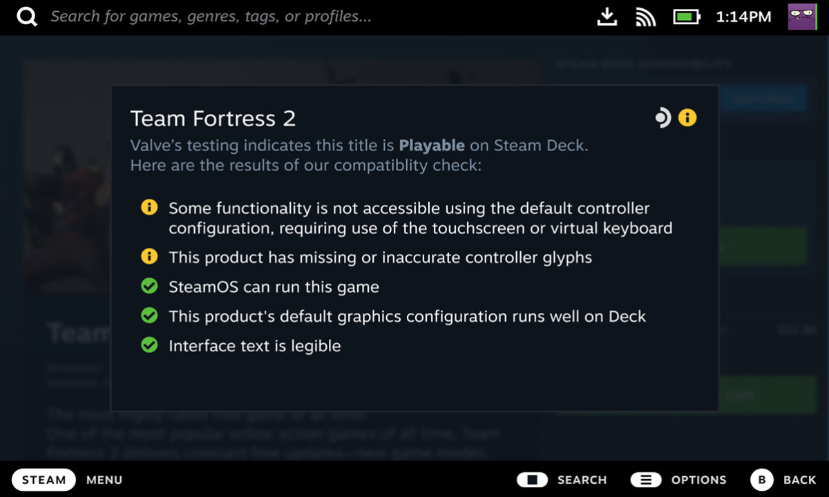 Así pues, para facilitar la identificación de estos juegos a los usuarios, todas estas insignias aparecerán tanto en nuestra biblioteca de Steam como en la tienda. Además, cada vez que vayamos a comprar un juego desde este ordenador de mano, podremos ver un informe completo de su compatibilidad, enumerando todos los problemas que podríamos esperar al jugarlo.