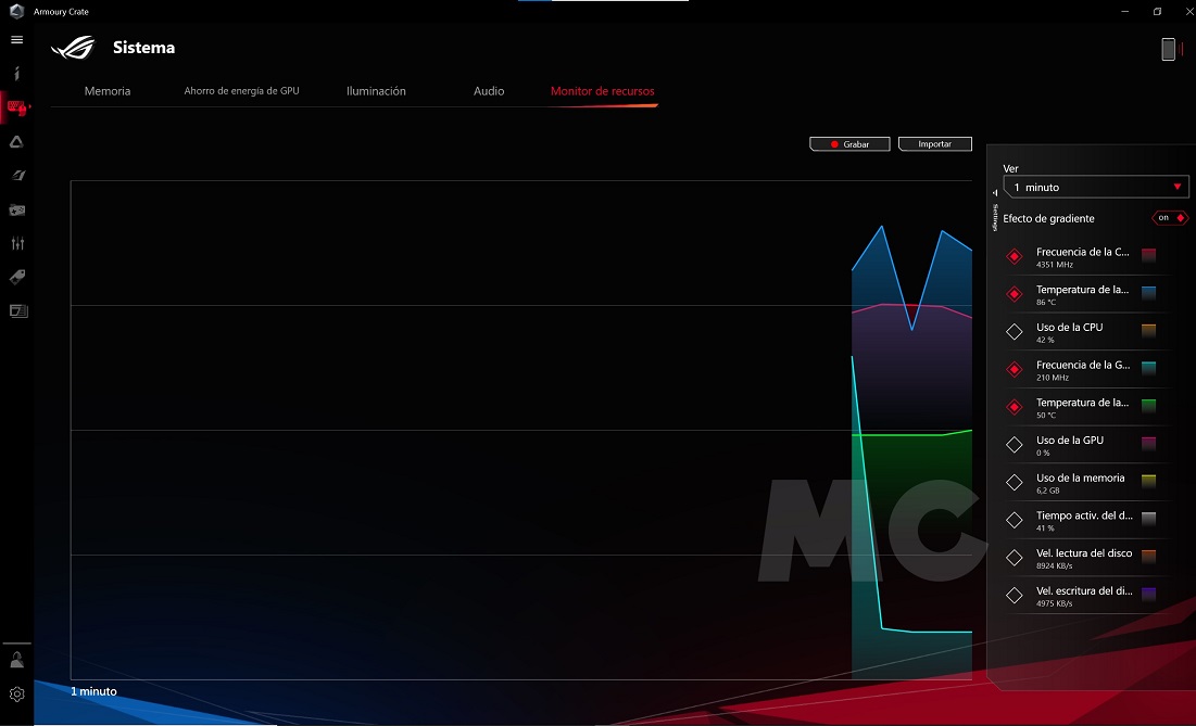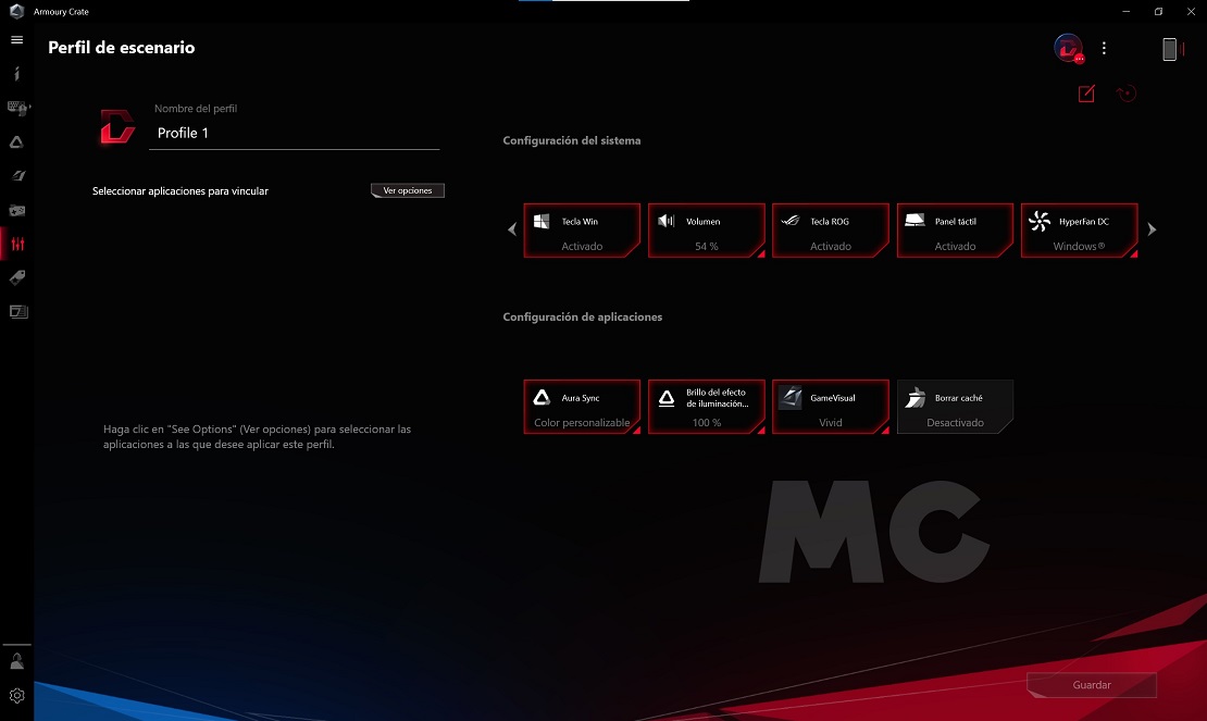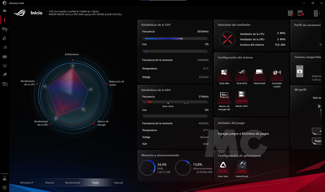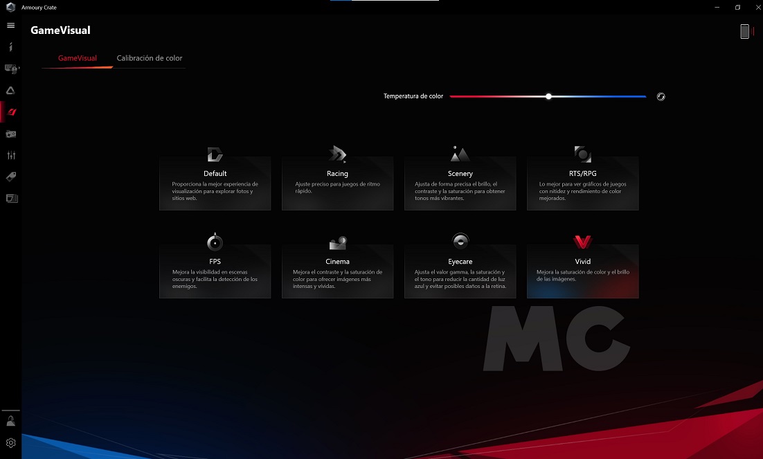 Con el software Armoury Crate de ASUS podemos controlar todos los aspectos más importantes del sistema, incluyendo desde el estado del equipo hasta la velocidad de los ventiladores, el color de la retroiluminación LED RGB del teclado y los perfiles de pantalla que queremos utilizar. Es una herramienta muy completa, muy útil y muy fácil de utilizar, así que merece la pena tenerla instalada en el equipo.