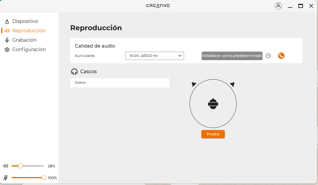 En los modos de reproducción podemos elegir la calidad del audio con las opciones de 16 bits con 48000 Hz, 44100 Hz, 48000 Hz y 96000 Hz. También nos da la opción de probar el estéreo para comprobar que funciona correctamente.