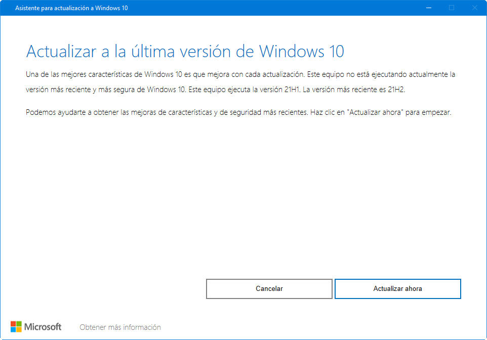 - Si ves ‘Actualización de funciones de Windows 10, versión 21H2’, podrás hacer clic en el enlace ‘descargar e instalar ahora’ para actualizar la versión manteniendo archivos personales, aplicaciones y configuraciones de usuario.