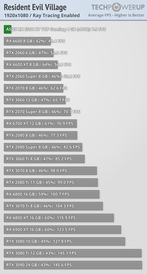 En trazado de rayos, la Radeon RX 6500 XT logra algunos resultados sorprendentes porque llega a superar, en algunos casos, incluso a la Radeon RX 6600 XT, al menos según los datos que recoge la fuente del análisis, aunque en general su rendimiento con dicha tecnología es muy pobre y se sitúa, salvo contadas (y raras) excepciones, muy por debajo de la RX 6600. Por ejemplo, en Deathloop la Radeon RX 6500 XT logra una media de 13 FPS, mientras que la Radeon RX 6600 consigue 43,4 FPS (1080p).