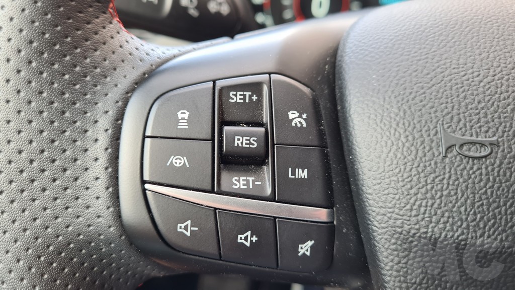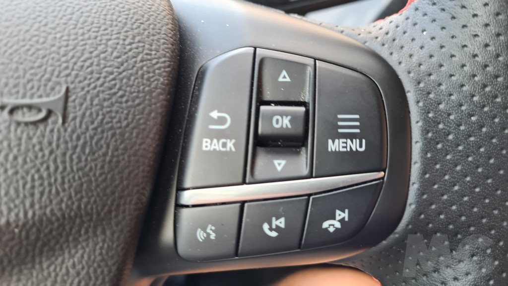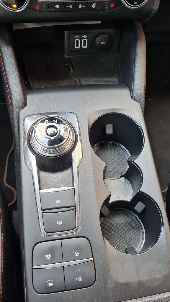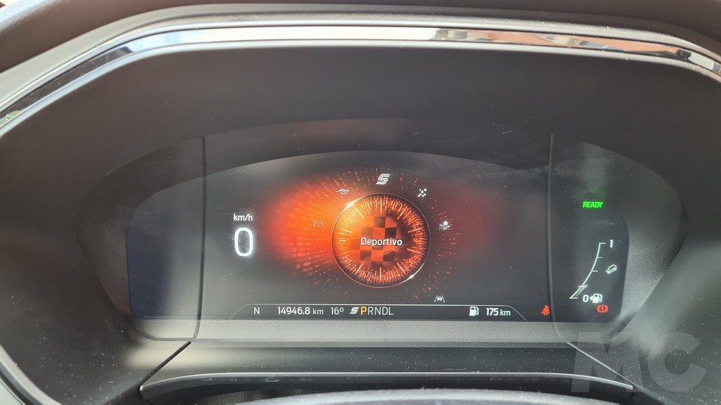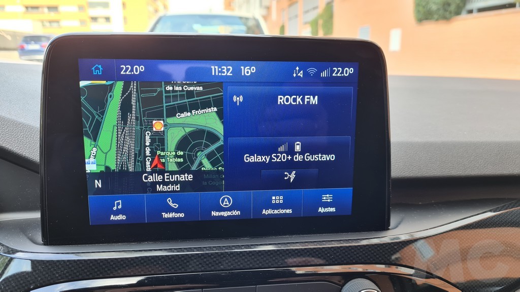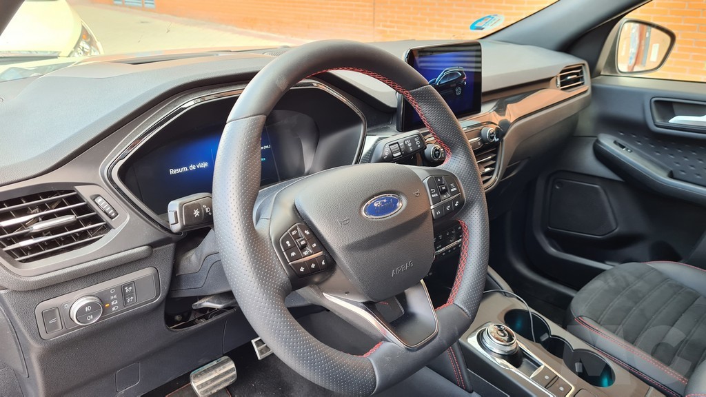 La pantalla de 12,4 pulgadas se encuentra en la parte superior del salpicadero, por lo que no tendremos que apartar la vista de la carretera para consultarla. Su funcionamiento responde al sistema Sync 3 de Ford compatible con Android Auto y Apple Car play con menús sencillos y muy visibles con información muy completa aunque la gráfica tenga un diseño algo anticuado. En la parte de abajo hay un espacio para dejar el teléfono móvil que dispone de carga por inducción, aunque como casi siempre el tamaño es algo justo. También encontraremos tomas USB y de 12 voltios para la alimentación.