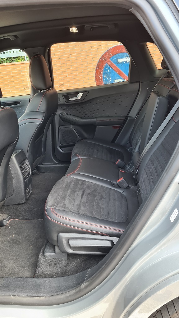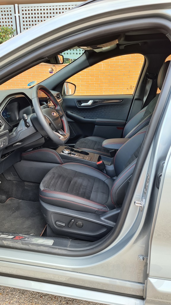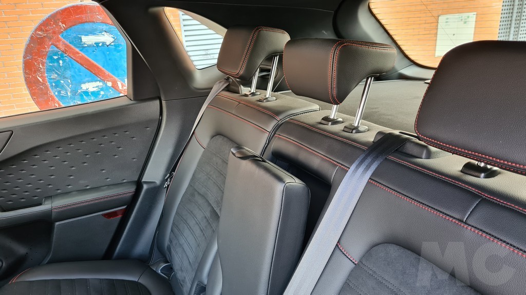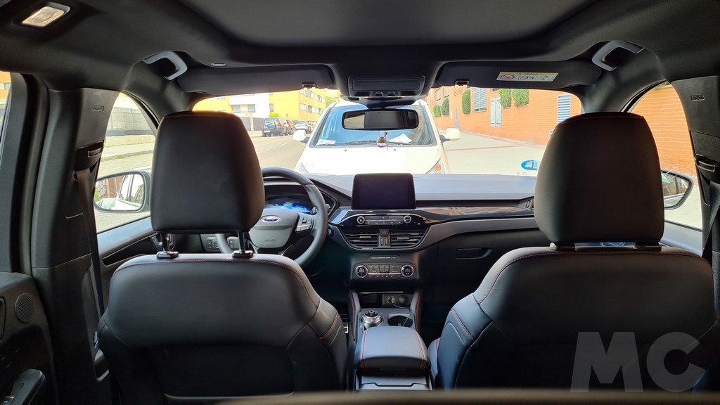 Nada más abrir la puerta del conductor el interior transmite amplitud, gracias también en nuestro caso a la aportación de luz natural que otorga el techo solar una vez abierto. Los asientos de la parte delantera son muy cómodos y se accede a ellos con mucha facilidad. El tacto de la combinación de tela y cuero sintético es agradable y el diseño de la banqueta y el respaldo es muy bueno y envolvente por lo que sujetan de forma muy eficaz cuando las condiciones de conducción así lo reclaman. Las costuras en rojo del acabado ST line les dan un toque más deportivo.